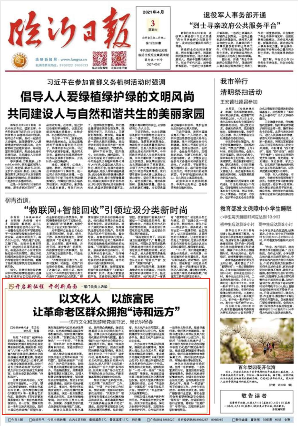 2021年4月3日,《临沂日报》头版以《以文化人 以旅富民 让革命老区群众拥抱“诗和远方”》为题,刊发了市文化和旅游局党组书记、局长钟呈春专访文章,全文如下: