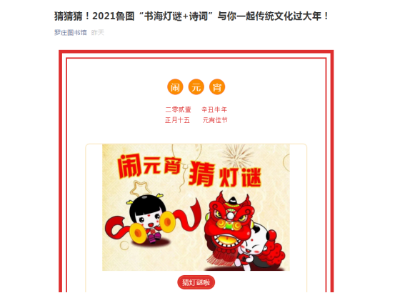 罗庄区图书馆、罗庄区文化馆节日期间在线上开展了系列惠民活动20余期,书画展览、阅读推广、全民诗词大会线上比赛、欢乐中国年照片征集、传统戏曲展示、非遗微课堂等,群众足不出户就可以享受到文化惠民带来的便利,丰富群众节日文化生活。(区文旅局 孙丽)