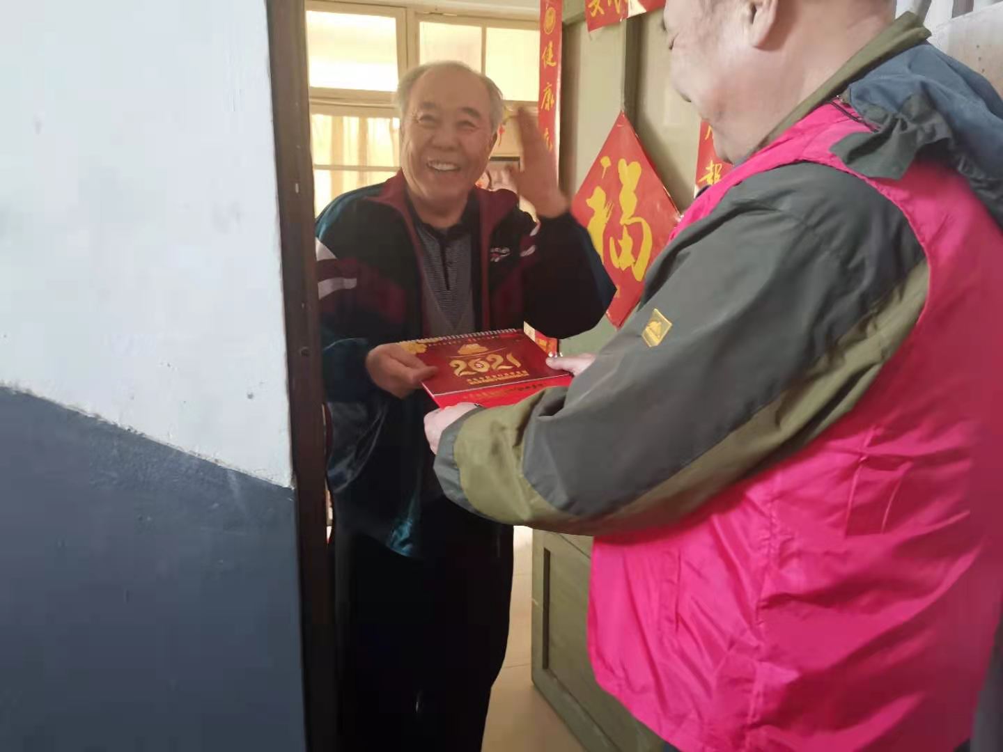 依托公益电影文化,志愿服务队在社区开展志愿服务活动中争做文化惠民的践行者。他们为社区居民送去蕴含公益电影特色文化台历,一起张贴春联福字,把“祝福”送到家,为群众添“年味”。
