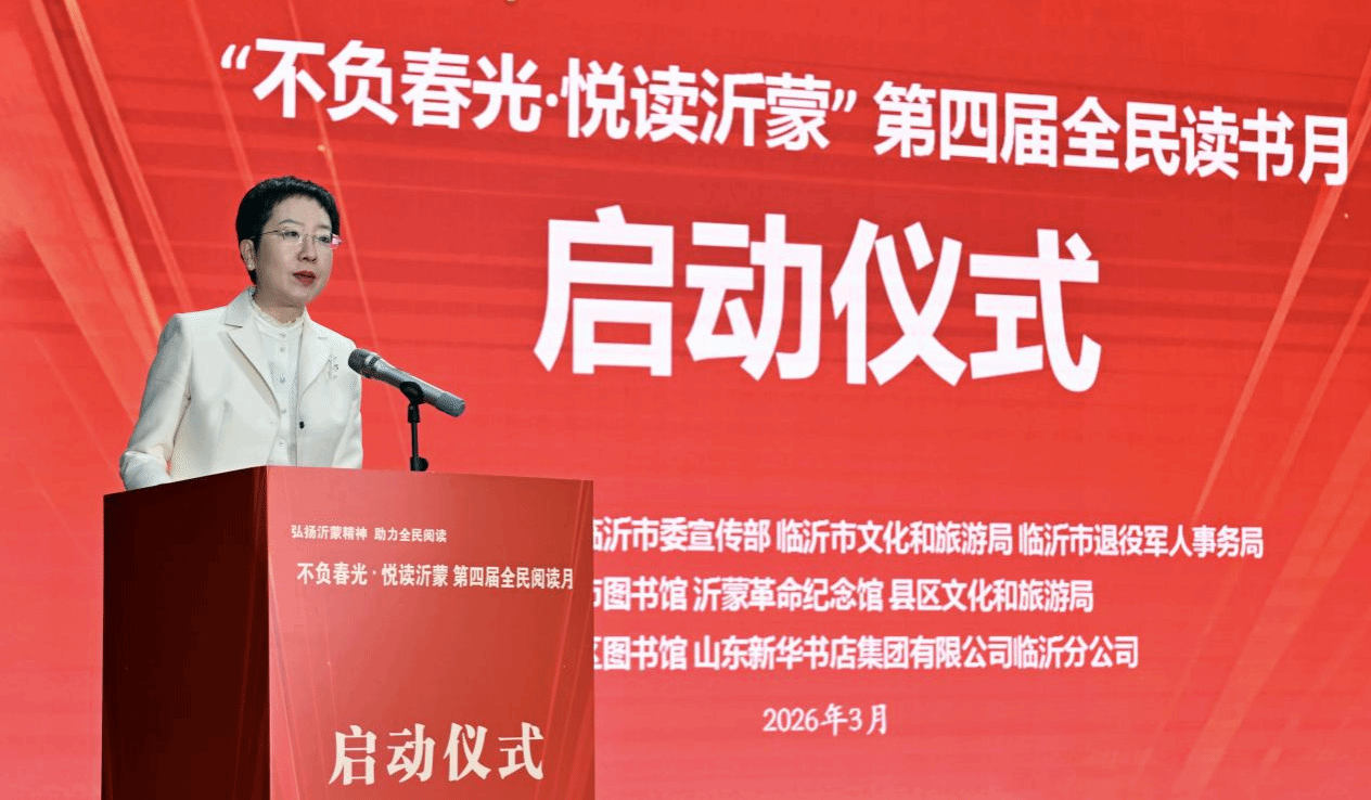 临沂市文化和旅游局党组书记王晓锋在启动仪式上致辞。她指出,本次阅读月以“弘扬沂蒙精神·助力全民阅读”为核心主题,让书香浸润沂蒙大地。活动将优质阅读资源送到街巷乡间,把普惠便捷的阅读服务铺满城乡角落;依托临沂厚重鲜活的红色文脉,在笔墨书香里传承红色记忆、赓续沂蒙精神;同时串联阅读与文旅风情,让文字行走山水之间,让阅读鲜活生动、贴近生活。一城书香,万般诗意,我们用心打造扎根乡土、融入日常、人人可及的阅读美好图景,让缕缕书香随处可遇,滋养整座城市。