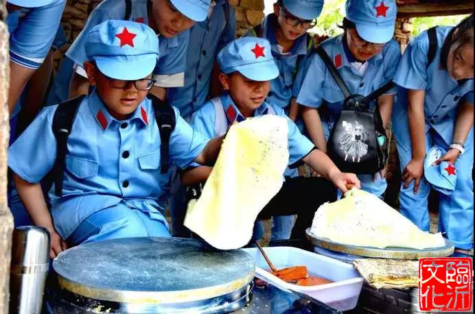 通过身穿八路军服装,进团队队列行军、写抗战口号、贴宣传标语、站岗放哨巡逻,通过行军途中唱《沂蒙颂》《太阳最红毛主席最亲》《绣红旗》等红色歌曲,并举行拉歌比赛,让当年抗战情景再现,营造了革命战争年代气氛,活化了课程,增强了研学效果。