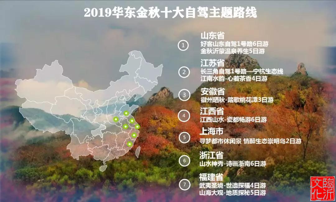 2019年华东自驾游峰会期间,山东、上海、浙江、江苏、安徽、江西、福建等华东六省一市自驾游协会组织共同发布金秋10大自驾游线路,推荐“金秋天蒙温泉养生”“好客山东自驾1号路”“江南水韵”“徽州晒秋”“唐诗之路”等主题鲜明自驾游线路,串联起秋季特色自驾资源,特别沂蒙山银座天蒙旅游区推出“把秋天装进后备箱”成为华东自驾线路一大亮点,巍巍沂蒙风情与金秋山货大集集合,成为国庆自驾出游的特色线路。