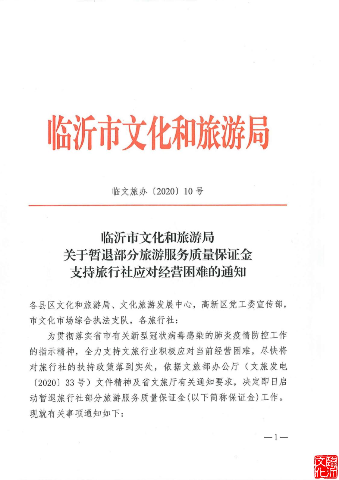 近日,为贯彻落实国家和省市有关新型冠状病毒感染的肺炎疫情防控工作的指示精神,全力支持旅行社行业积极应对当前经营困难,临沂市文化和旅游局下发《关于暂退部分旅游服务质量保证金支持旅行社应对经营困难的通知》,启动了暂退旅行社部分旅游服务质量保证金(以下简称保证金)工作。