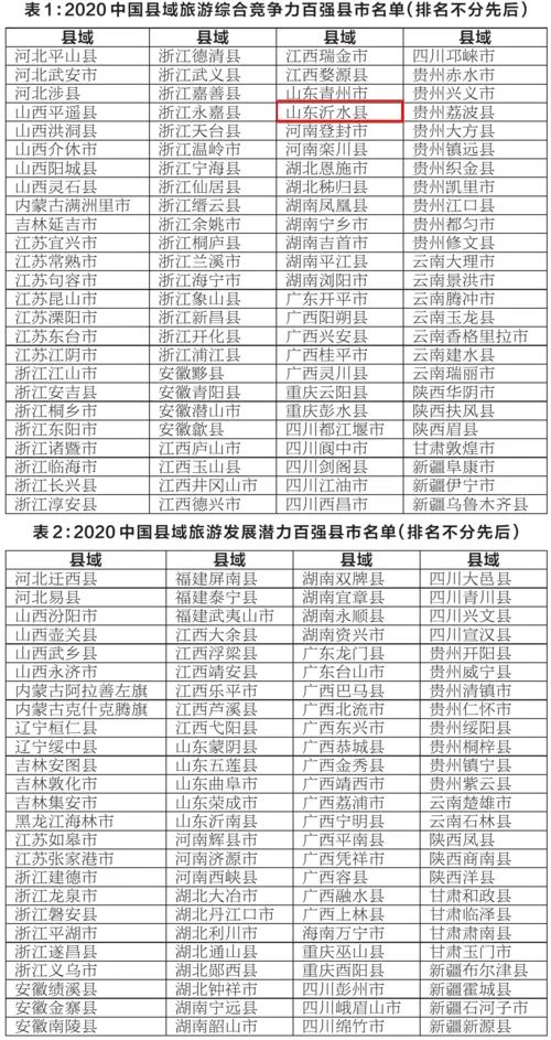 11月12日,竞争力智库、中国经济导报社、中国信息协会信息化发展研究院和北京中新城市规划设计研究院等机构在北京联合发布《中国县域旅游竞争力报告2020》。《报告》对2019年我国县域旅游发展情况作了全面梳理,完成了全国县域旅游综合竞争力和县域旅游发展潜力评价,发布了“2020中国县域旅游综合竞争力百强县市”和“2020中国县域旅游发展潜力百强县市”(简称“2020中国旅游百强县”和“2020中国旅游潜力百强县”)。山东省沂水县再次入选中国旅游百强县称号,这是沂水连续第三年荣获中国旅游百强县!