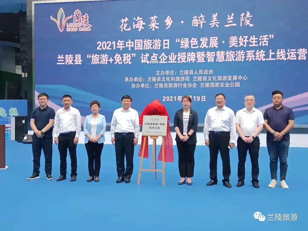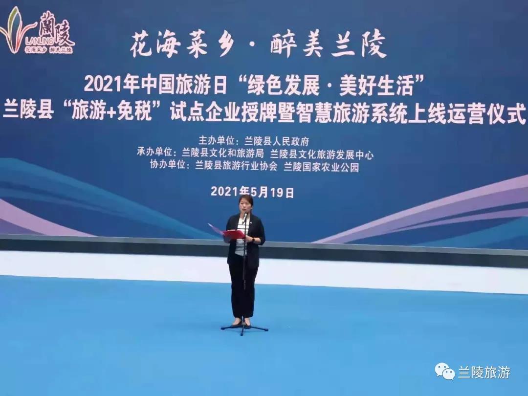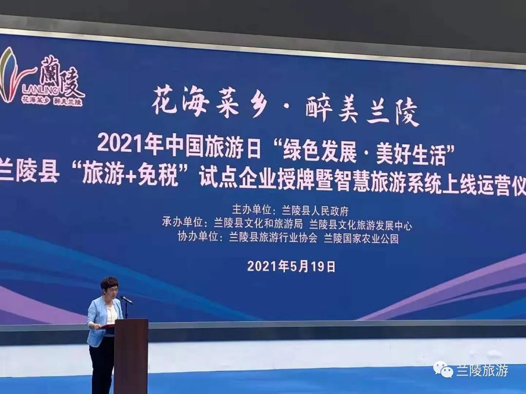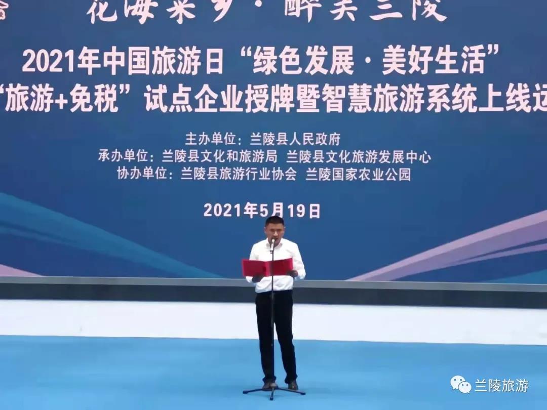 5月19日上午,由兰陵县政府主办,县文化和旅游局、县文化旅游发展中心承办,县旅游行业协会、兰陵国家农业公园协办的2021年中国旅游日兰陵县“旅游+免税”试点企业授牌暨智慧旅游系统上线运营仪式在兰陵县全域旅游集散服务中心(临沂农展馆)举行。兰陵县委常委、代村社区党委书记王传喜,兰陵县政府副县长苏妮娜参加,共同为兰陵县“旅游+免税”试点企业揭牌,县文化旅游局局长刘献华宣布兰陵智慧旅游系统上线运营。