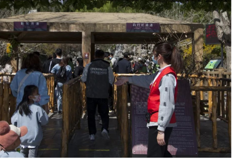 全县11个县直部门和5个乡镇、街道下沉一线,化身志愿者开展包扶工作。景区内,广播及巡逻人员在各处提醒游客保持距离不扎堆、文明游玩,并通过广播和LED显示屏进行文明告知、文明提醒、文明规劝。
