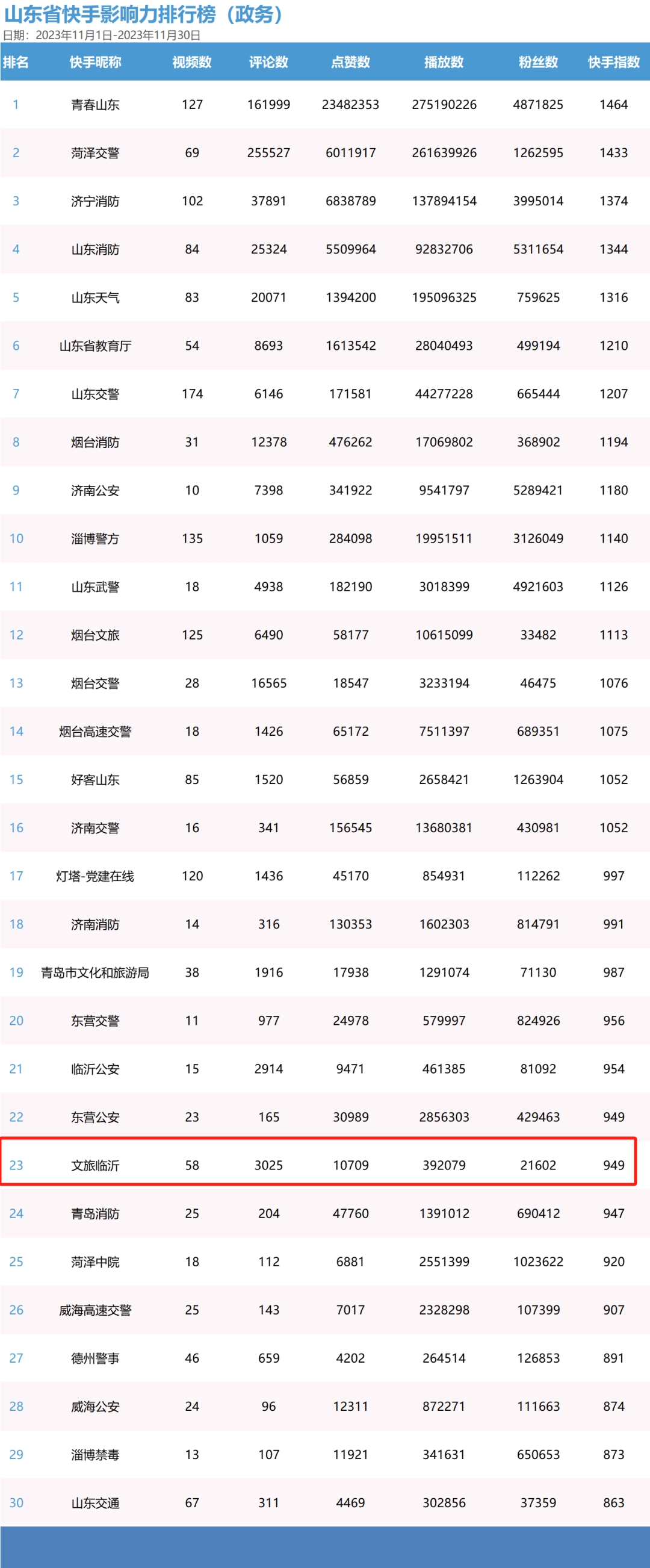 近日,山东省新媒体行业协会发布了《山东省新媒体影响力排行榜2023年11月榜单及解读》,“文旅临沂”凭借创新的运维思维、高质量的宣传内容和较高的传播影响力,在全省政务新媒体账号中脱颖而出,抖音、头条、快手官方账号均入选全省新媒体影响力排行榜。其中“文旅临沂”抖音账号全省排名第8,今日头条账号全省排名第19,快手账号全省排名第23。