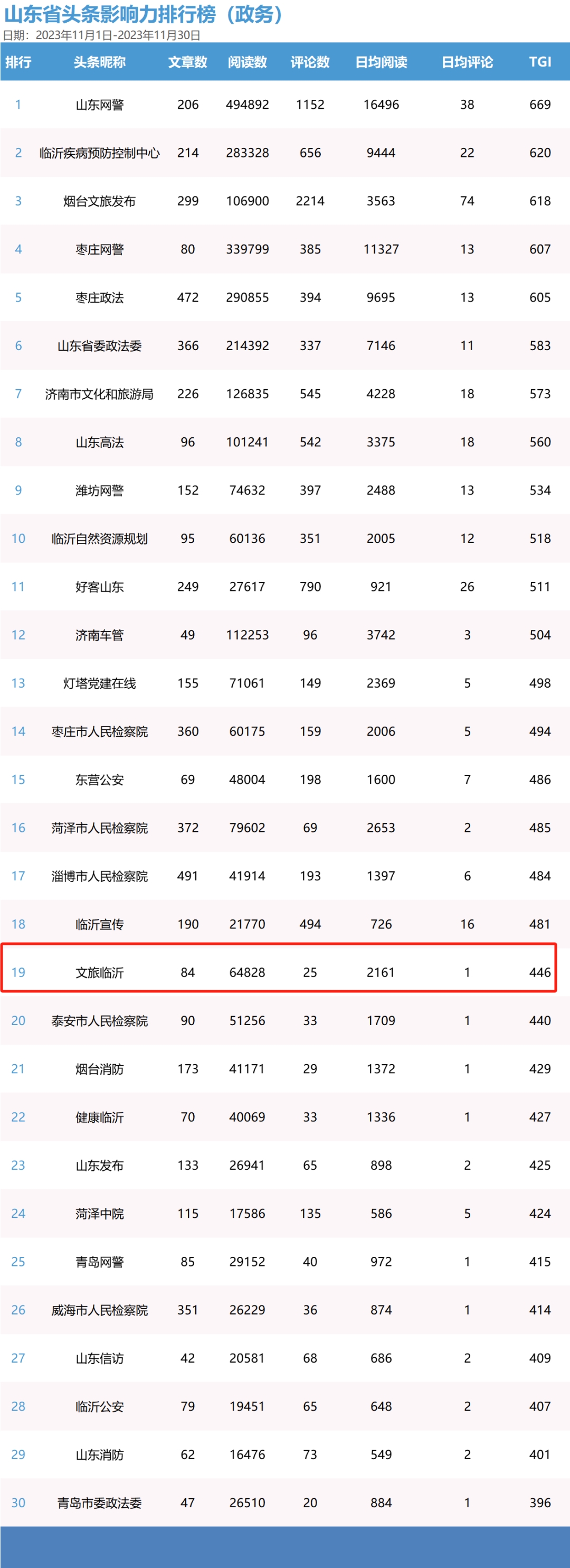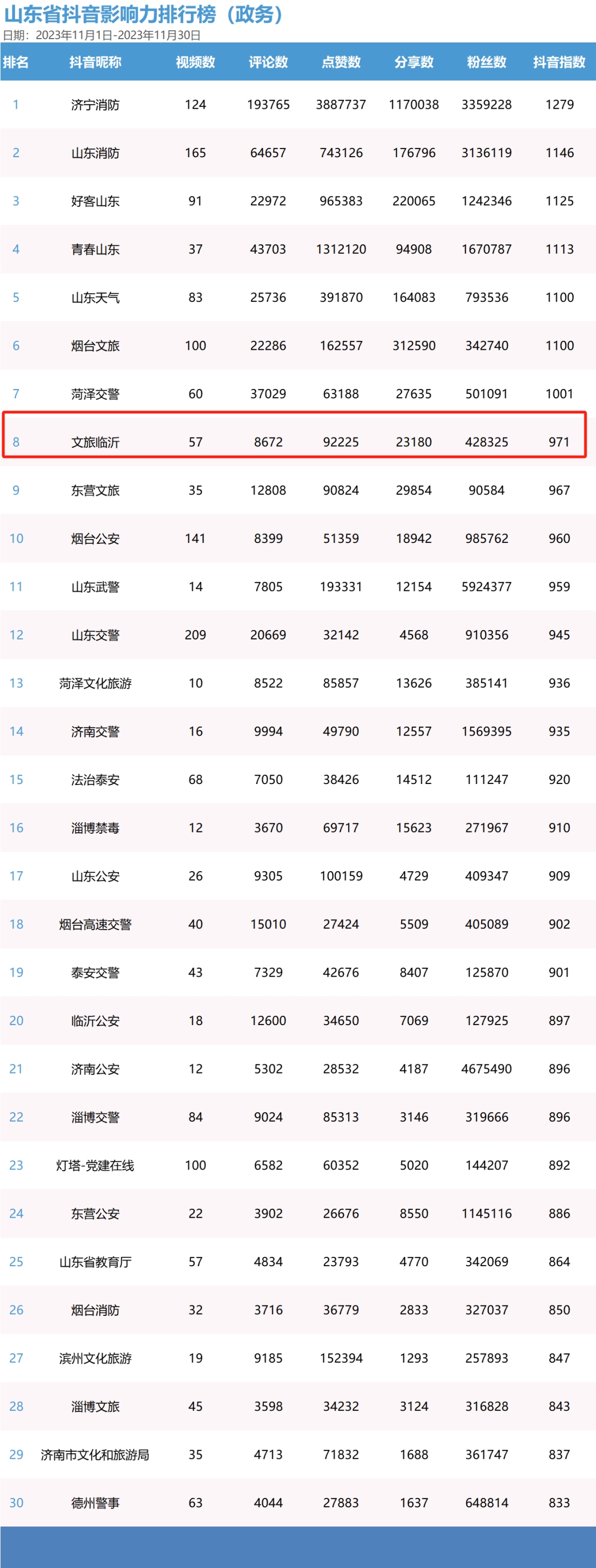 据悉,此次月度榜单是根据2023年11月1日至11月30日期间,全省政务及公共服务账号、媒体账号在微博、微信、抖音、今日头条和快手五大平台上的发文数据和传播数据,综合微博传播指数(BCI)、微信传播指数(WCI)、抖音号传播力指数(DCI)、头条号传播指数(TGI)、快手号传播力指数(KCI)公式统计分析传播影响力,并以此为依据得出各平台最具传播影响力的TOP30账号。 在未来,“文旅临沂”将继续秉承创新的理念,努力提升内容质量与吸引力,以期为大家奉献更多优秀作品。感谢大家的关注与支持,我们期待与您一起探索临沂文旅更多的美丽故事。