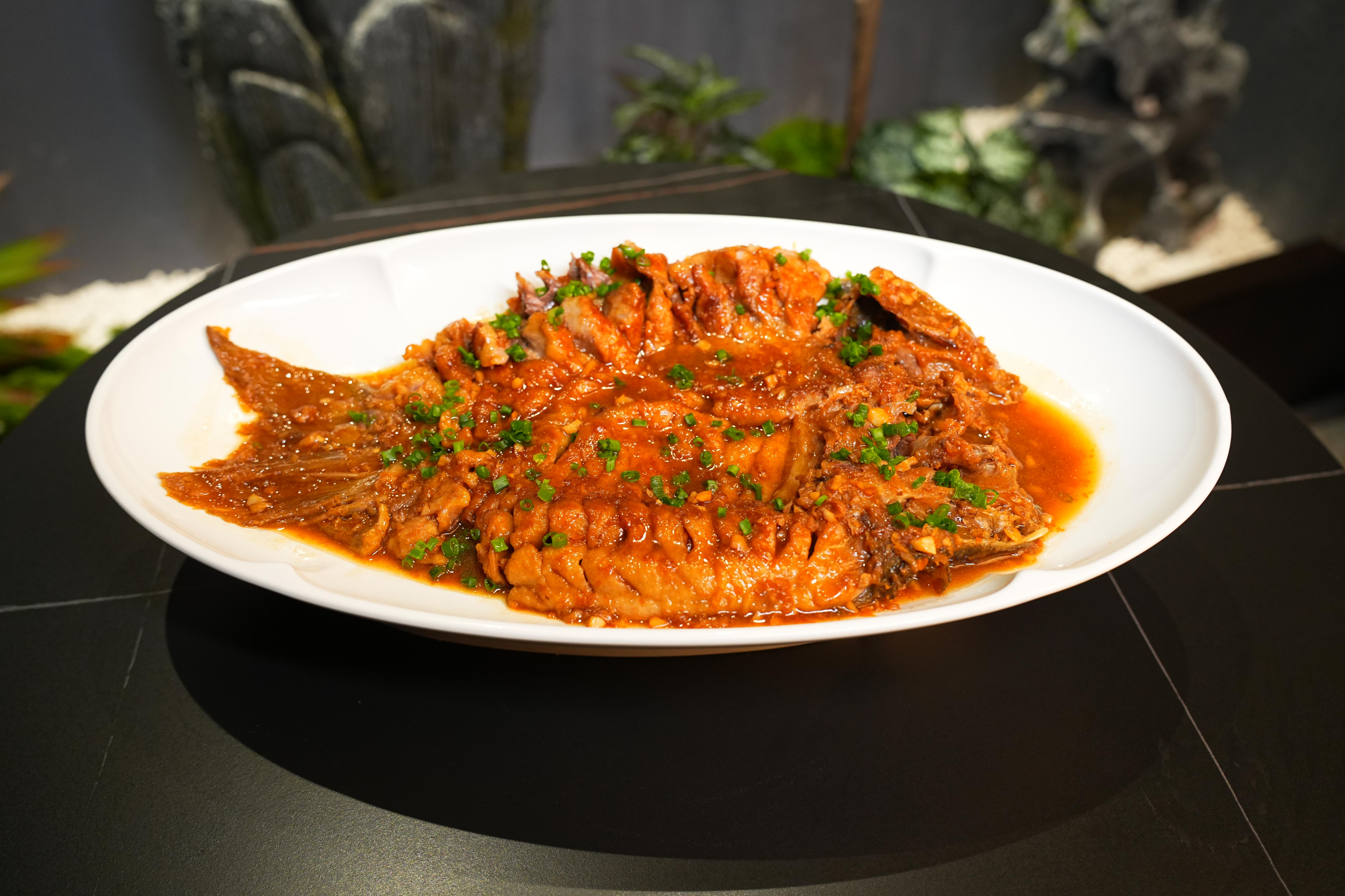 起锅放油少许,加葱、姜、蒜末炒香,加入调料,加入骨汤(或开水)放入炸好的鱼大火烧开,然后转小火收汁,然后加葱油,出锅装盘即可。